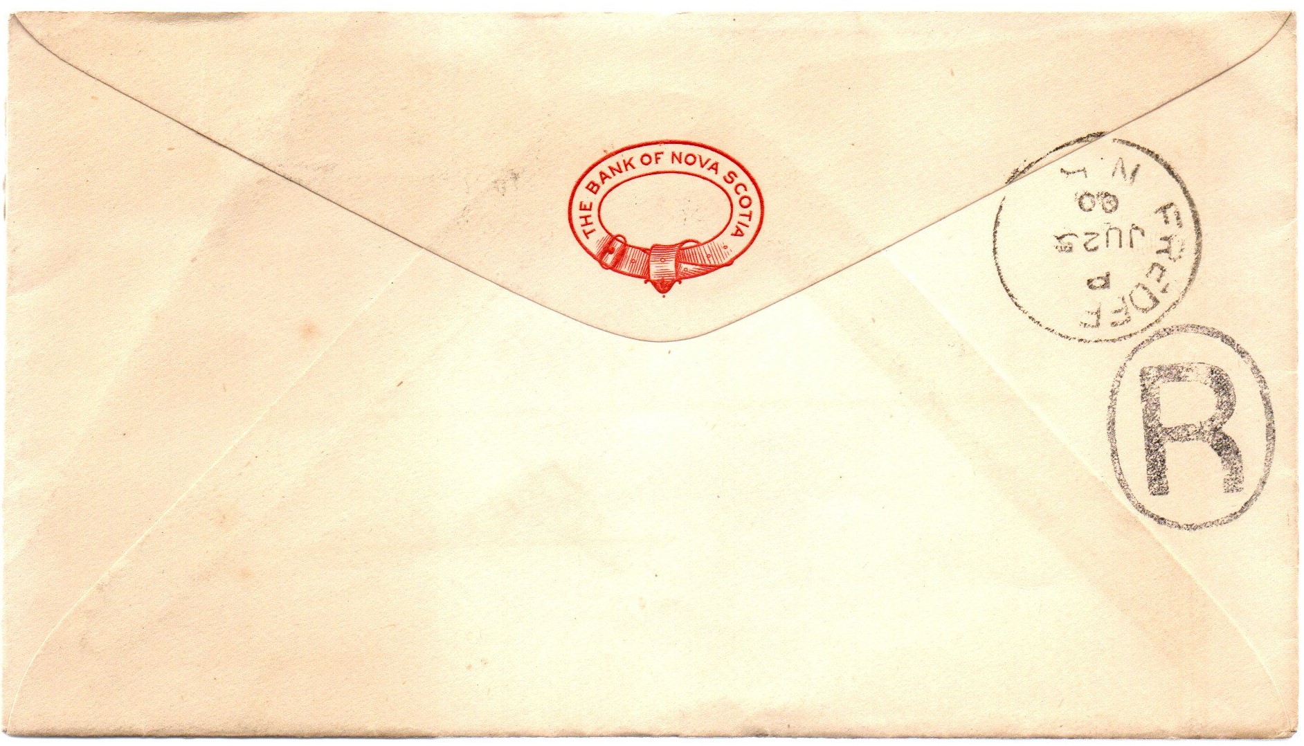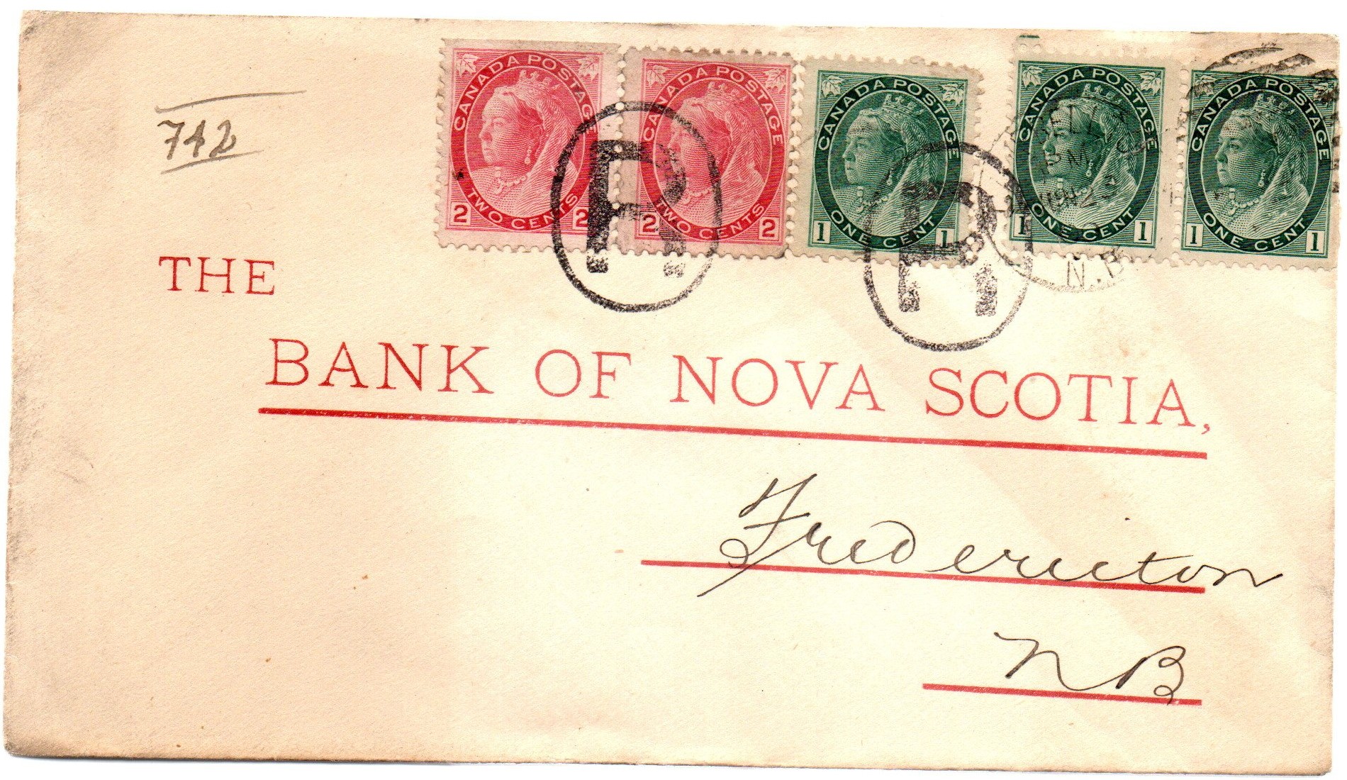 Registered cover with a pair and single 1 cent (#75) and 2 cents (#78) and 2 cents that we believe is the upper center stamp of the booklet pane (#77bs) paying the 2 cents surface letter fee and 5 cents registered fee. Cancelled by 2 oval “R” and a CAMPBELLTON N.B. June 23, 1900, 9 bars circular Duplex Cancel (DNB-12), the earliest recorded date for that duplex is May 24, 1900. The back has an embossed The Bank of Nova Scotia logo, an oval “R” and a Fredericton receiver CDS June 25, 1900.