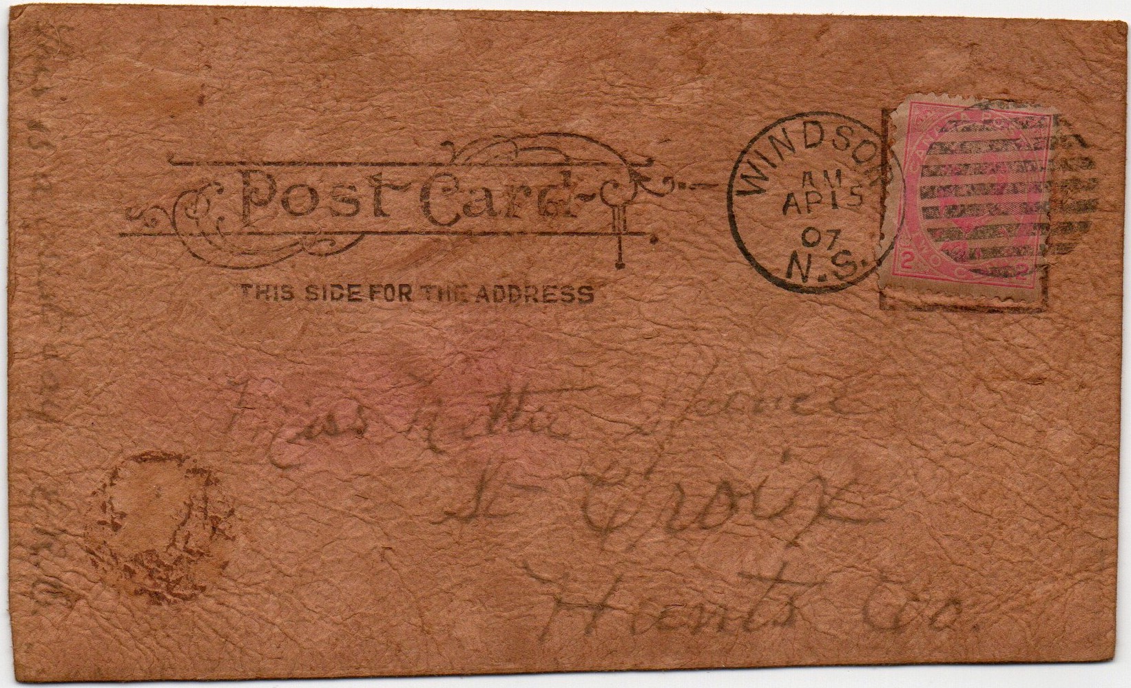 Canada 1907 Leather Post Card from Windsor Ont, April 15, 1907, to ST CROIX, HANTS County Nova Scotia Duplex PC19070415 - Bob Bazaar