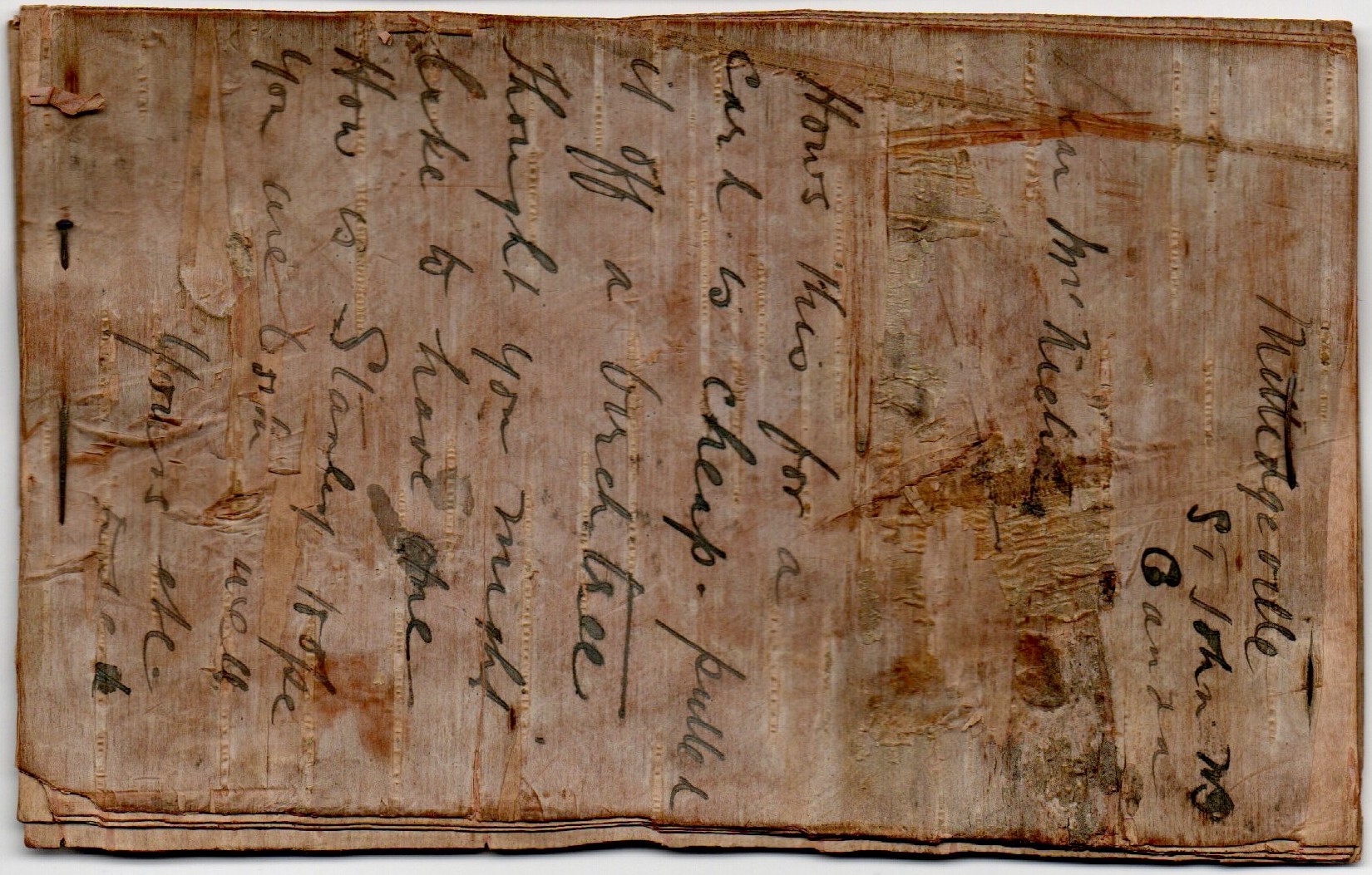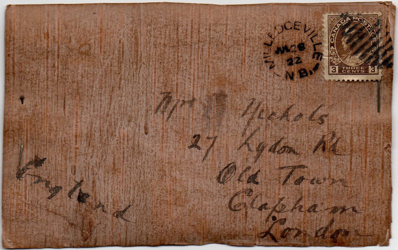 Canada Birch Bark Post Card from MILLEDGEVILLE NEW BRUNSWICK dated July 28,1922 to CLAPHAM, LONDON,ENGLAND. Unusual postcard cut from a piece of birch bark. The message on the back reads in part”…Pulled it off a birch tree…” The 3 cents Admiral #108 stamp is nicely tied paying the 2 cents + 1 cent for the bark. The card has a couple of pins at the side, inserted by the original sender, to keep the layers from seperating in the mail. Nice Item !