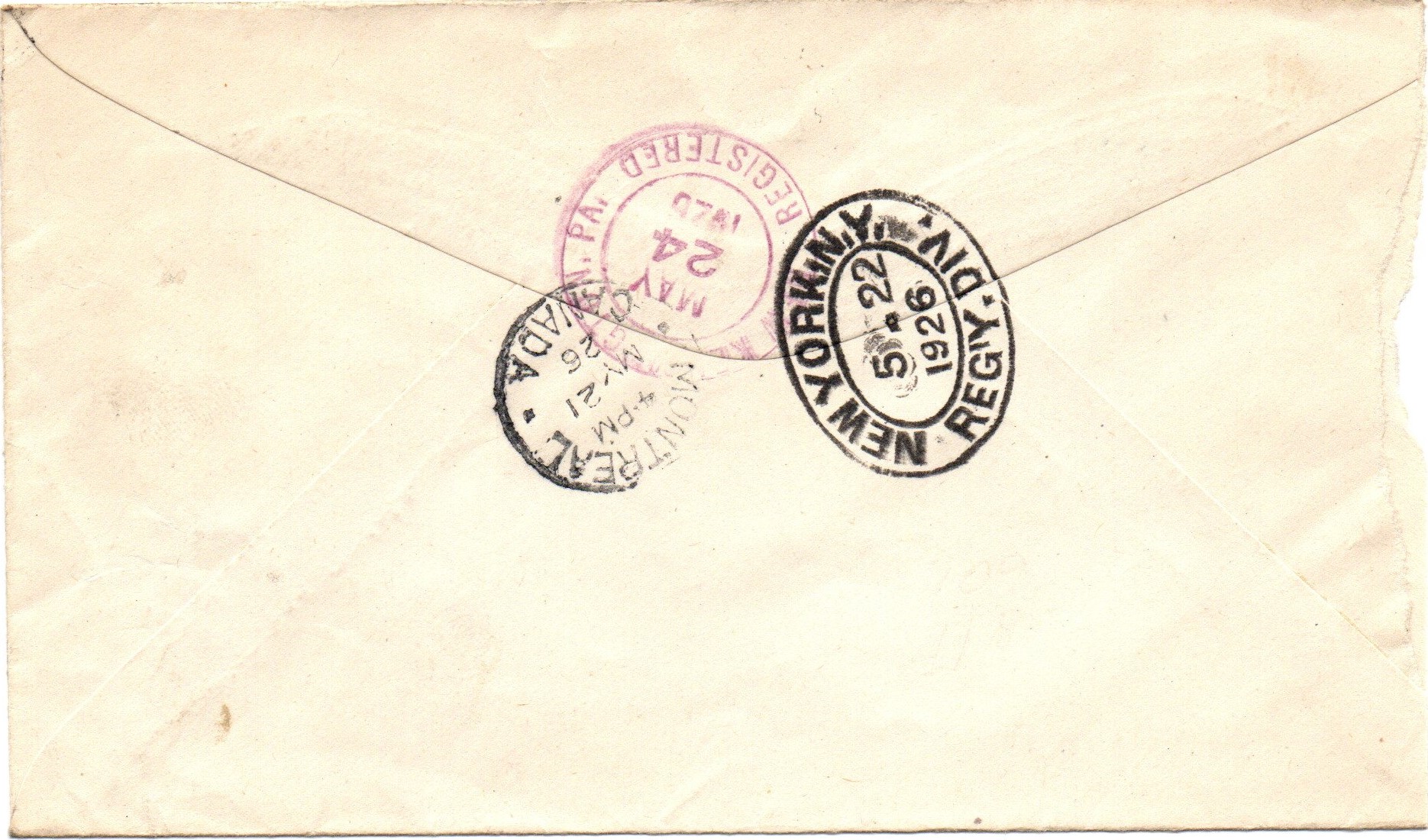 Affixed with a 10 cents bistre brown #118 and a 3 cents carmine #109 paying the 3 cents letter rate and the 10 cents Registered fee. MONTREAL CANADA May 21,1926 CDS and REGISTERED MONTREAL, P.Q. box on front of an advertising cover of SOUTHERN POWER CANADA. Back has MONTREAL CDS along with transit NEW YORK N.Y. REG’Y. DIV. May 22, 1926, and receiver NEW KENSINGTON PA REGISTERED May 24, 1926.