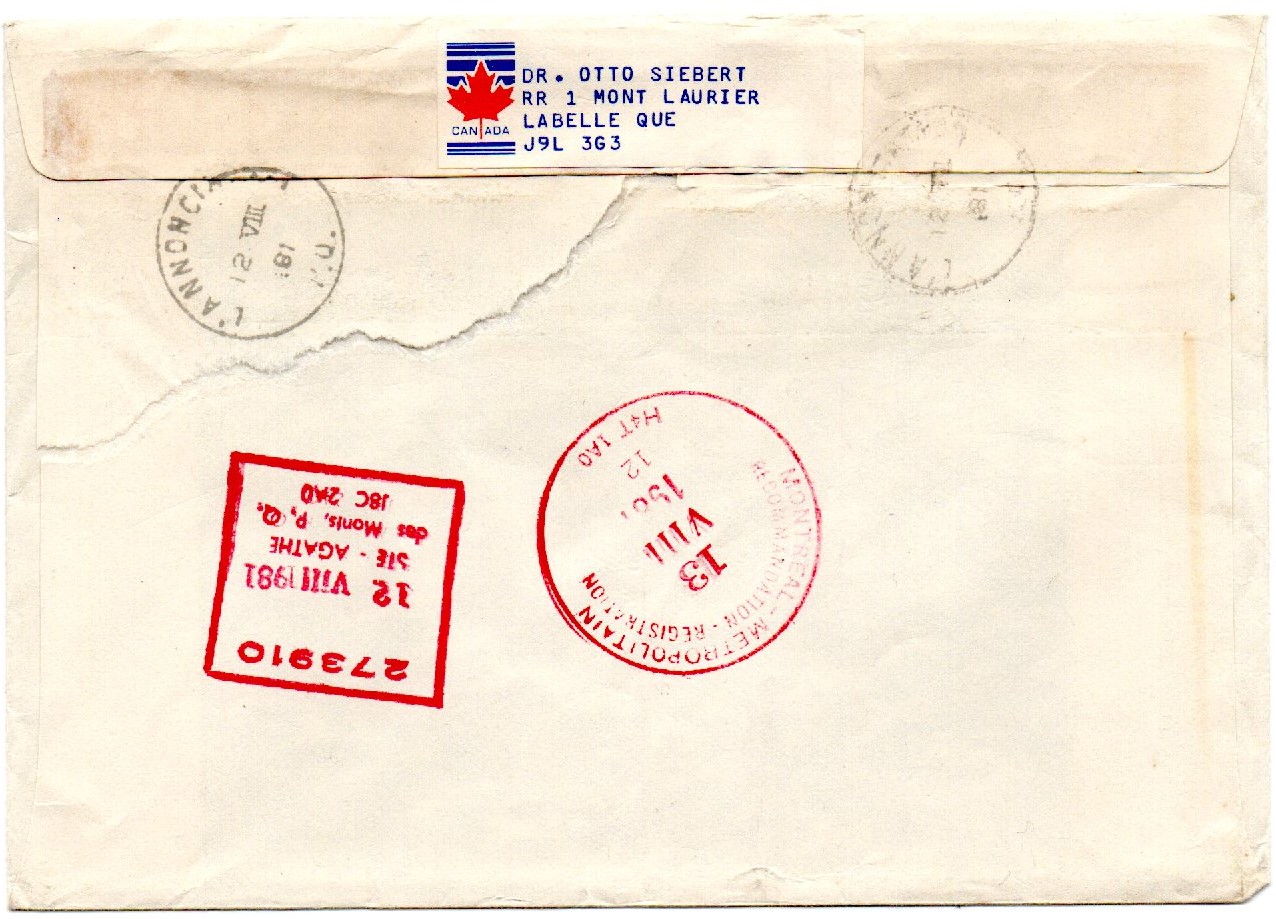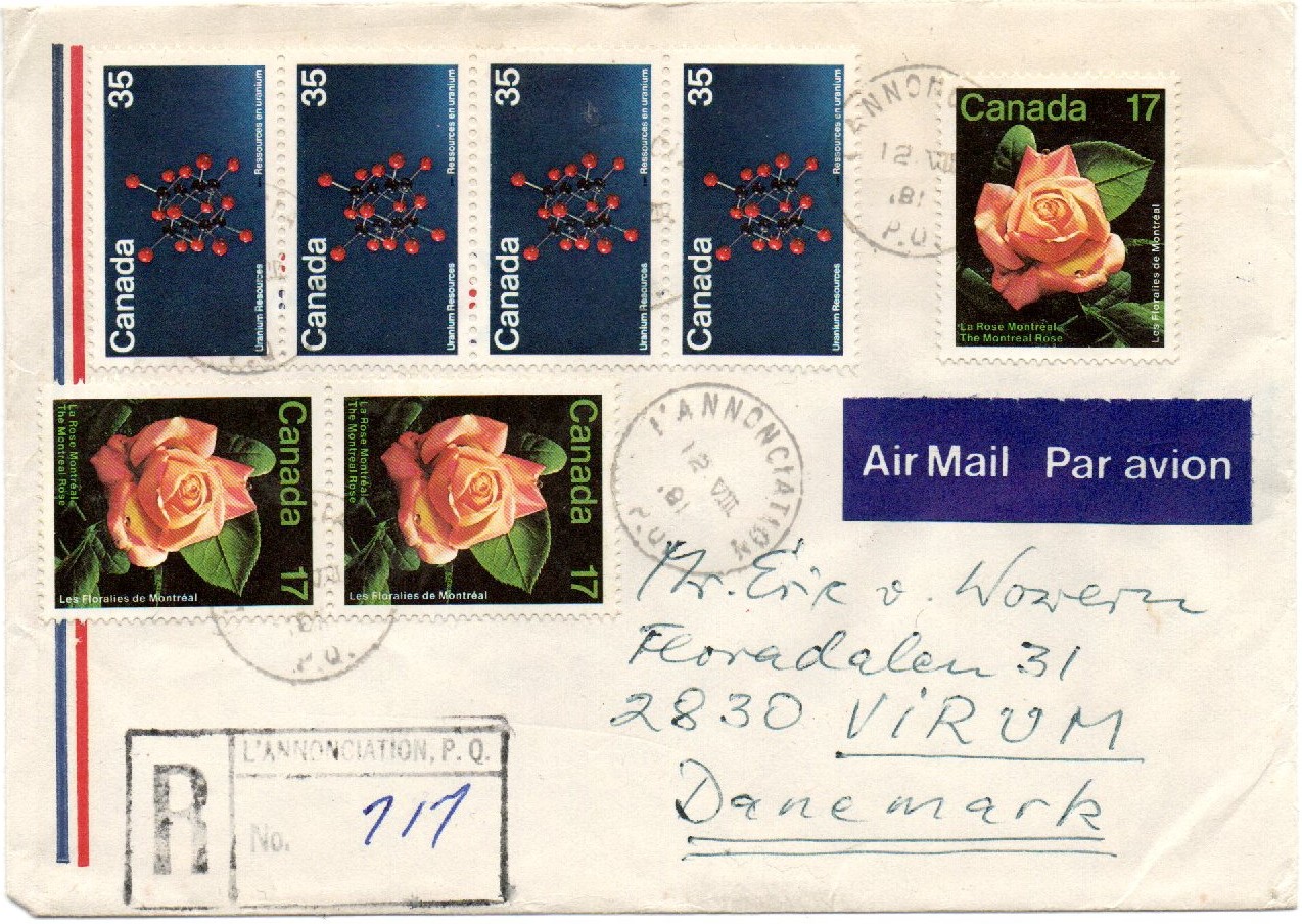 Registered Air Mail cover from L’ANNONCIATION P.Q. to Virum Denmark Correct usage of all stamps the 17 cents was issued July 22nd 1981