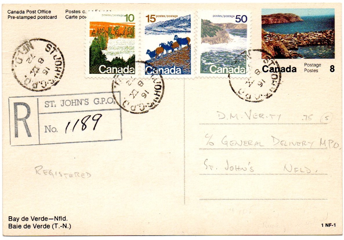 Canada Post “”Pictorial Issues”” BAY DE VERDE, Newfoundland Registered postcard September 8, 1972, FDC of the 10 cents Forest #594, 15 cents Mountain Sheep #595 and 50 cents Seashore #598 all from the LANDSCAPE DEFINITIVES issued on that day. Paying the 8 cents letter rate and 75 cent Registration fee for $50 to $100 coverage. It was 50 cents for under $50. These post cards are seldom seen used in the correct usage time and rarely Registered, sent within the city, has a boxed “R” St, JOHNS G.P.O. cancel and ST. JOHNS – G.P.O. NFLD September 8, 1972, CDS cancel. A scarce FDC item sent by a philatelist.