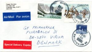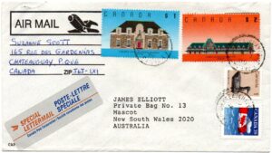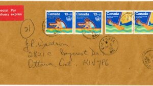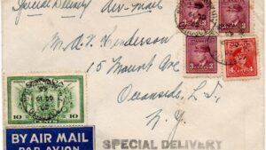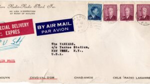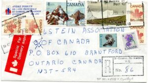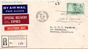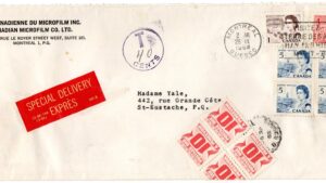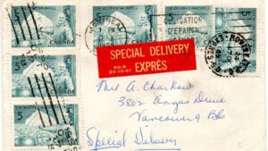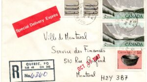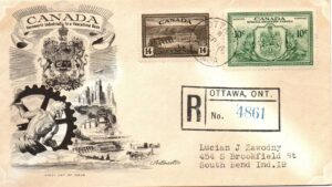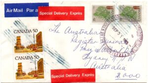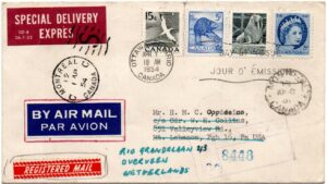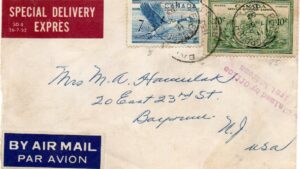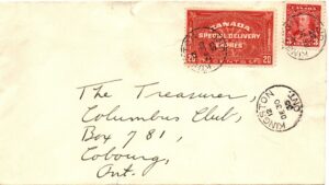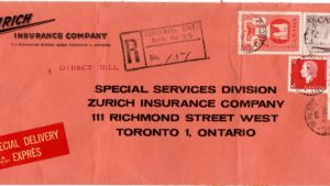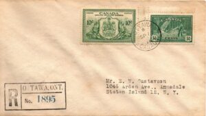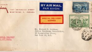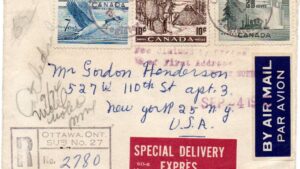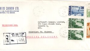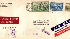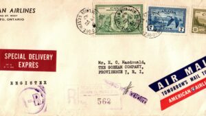 REGISTERED, A-R , SPECIAL DELIVERY cover from American Airlines addressed to The Gorham Company, The letter is franked with a 10c olive Great Bear Lake NWT from the King George VI Peace Issue (#268), 7c blue airmail Canada Gease near Sudbury ON, the last Airmail stamp issued (#C9) and 10c green special delivery from the Peace Issue, last Special Delivery stamp issued (#E11) 12/VII/49 ADELAIDE ST. STN. TORONTO ONT. Cds cancels and addressed to PROVIDENCE R. I. USA. The cover has a scarce AMERCICAN AIRLINES AIR MAIL TOMORROW’S MAIL TODAY label and a Special Delivery EXPRÈS sticker (SD-8 2-4-48). The front has a purple boxed Registration, a PASSED FOR EXPORT cancel, and A-R in circle handstamps. The back has PROVIDENCE R.I. (REG. DIV.) receiving cancel. Colorful and stamps used in period. The Gorham Manufacturing Company was one of the largest American manufacturers of sterling and silverplate and a foundry for bronze sculpture.