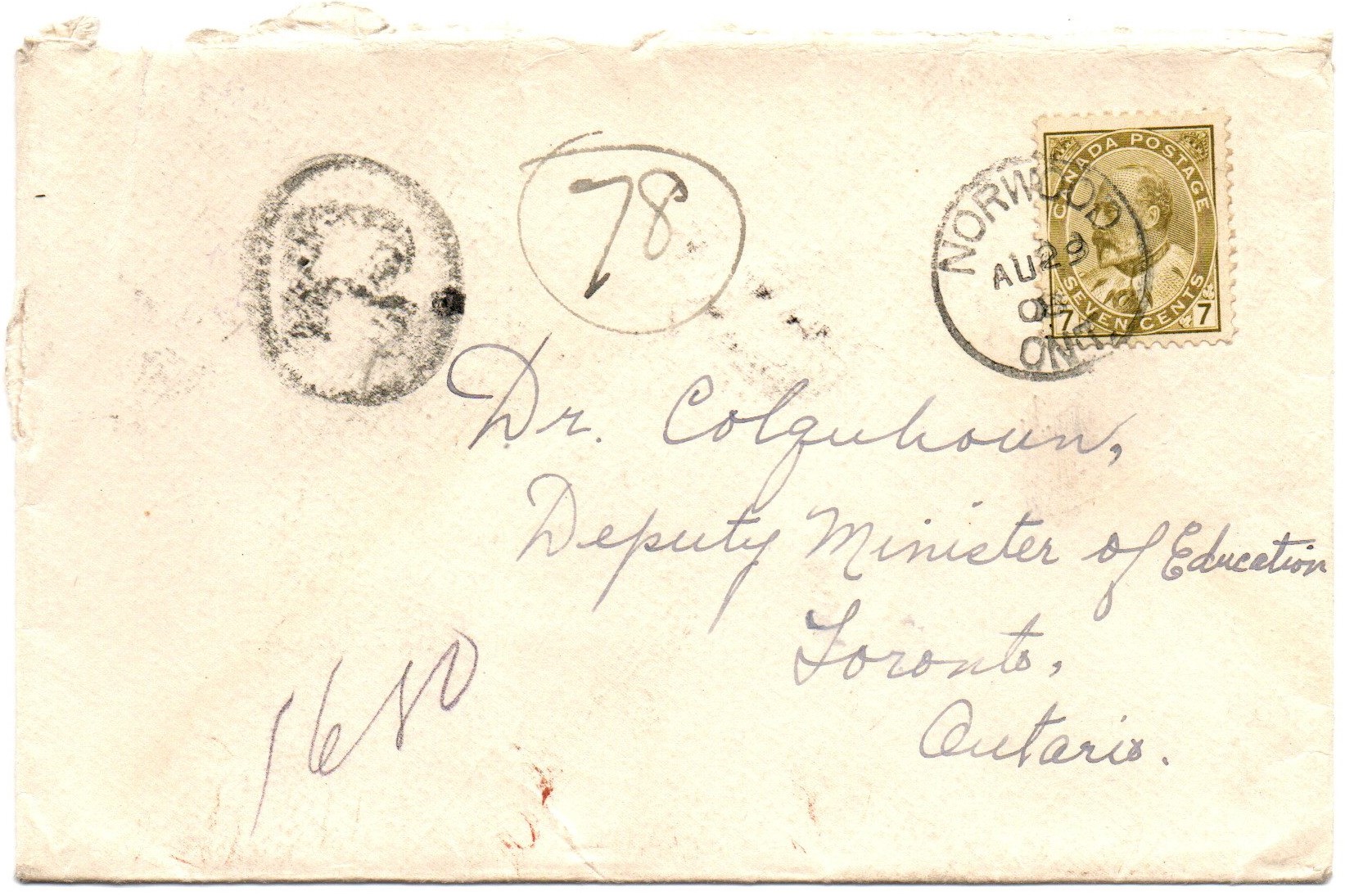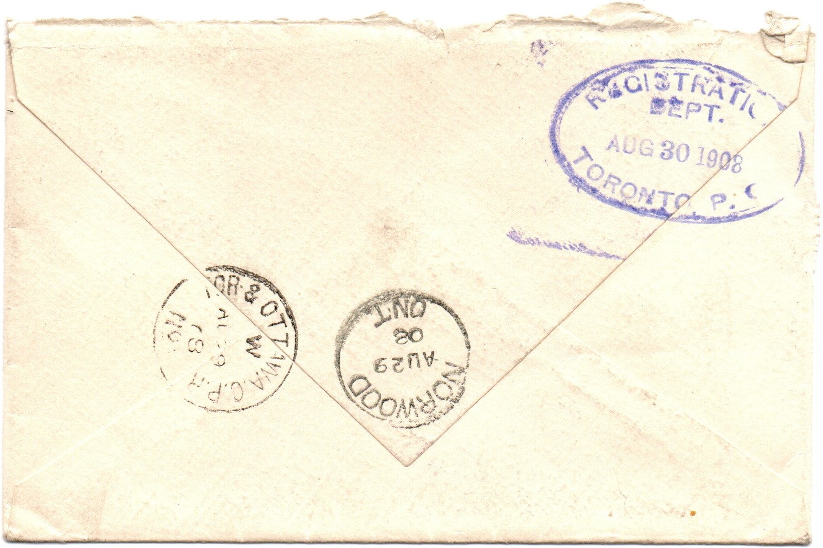 Registered cover with a 7 cents King Edward VII #92 paying the 2 cents surface letter rate and the 5 cents registered fee. Cancelled by a NORWOOD August 29, 1908, CDS cancel and an oval “R”. On the back cover there is a NORWOOD August 29, 1908, a TOR & OTTAWA C.P.R. August 29, 1908, RPO cancel, and a receiver cancel REGISTRATION DEPT. AUG 30, 1908, TORONTO P.O. in violet. Nice clean Edward VII cover