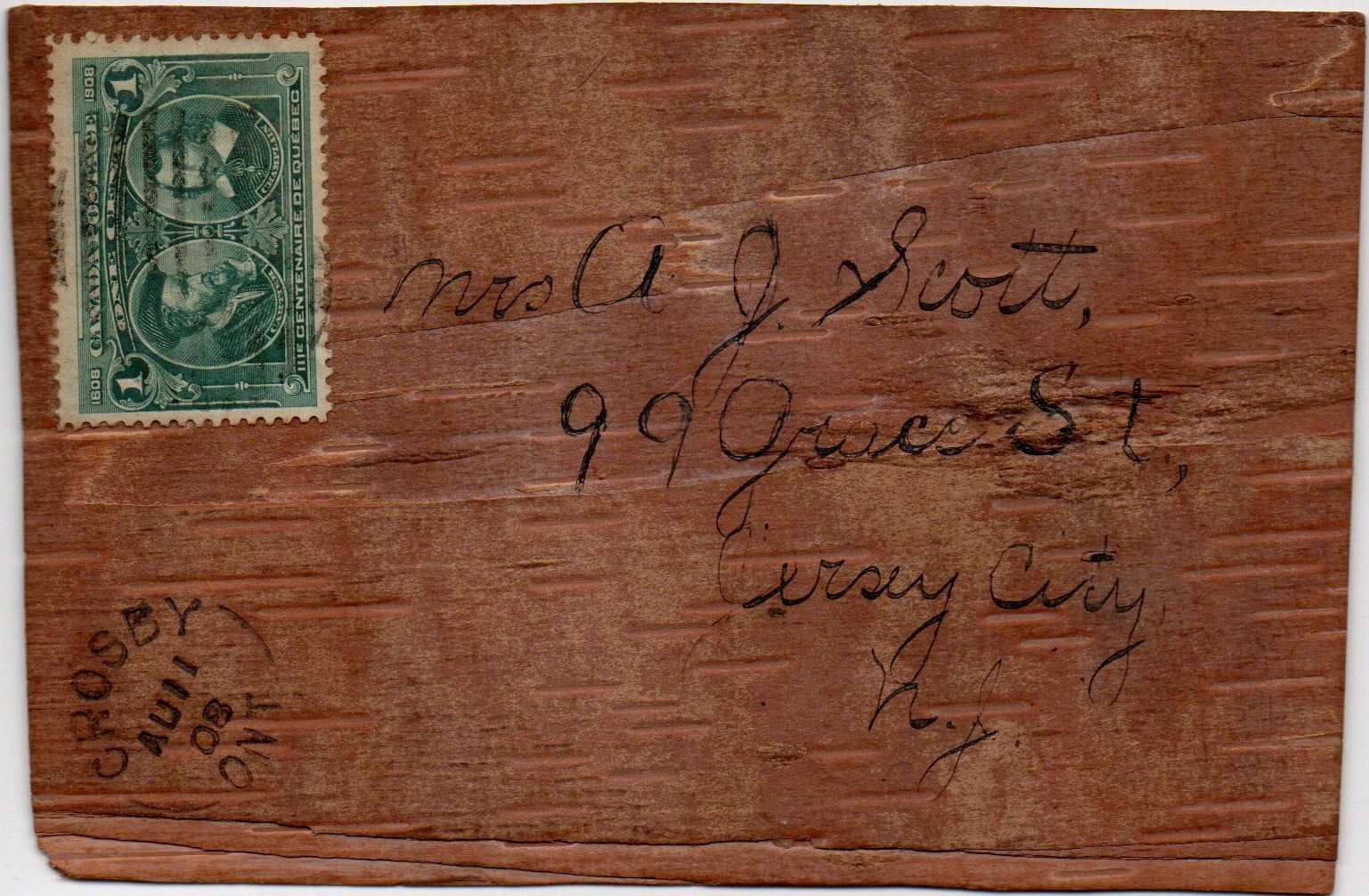 Canada Birch Bark Post Card dated August 7, 1908 mailed from CROSBY ONT. August 11, 1908 to JERSEY CITY N.J. Letter to a mother. Sent with a 1 cent Quebec Tercentenary #97 under paying by one cent. Nice and scarce.