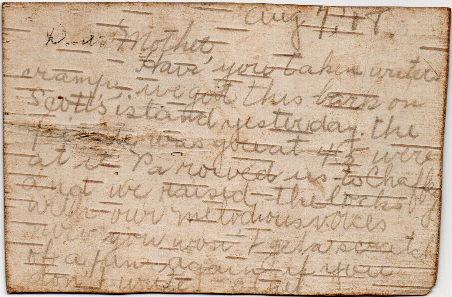 Canada Birch Bark Post Card dated August 7, 1908 mailed from CROSBY ONT PC19080807