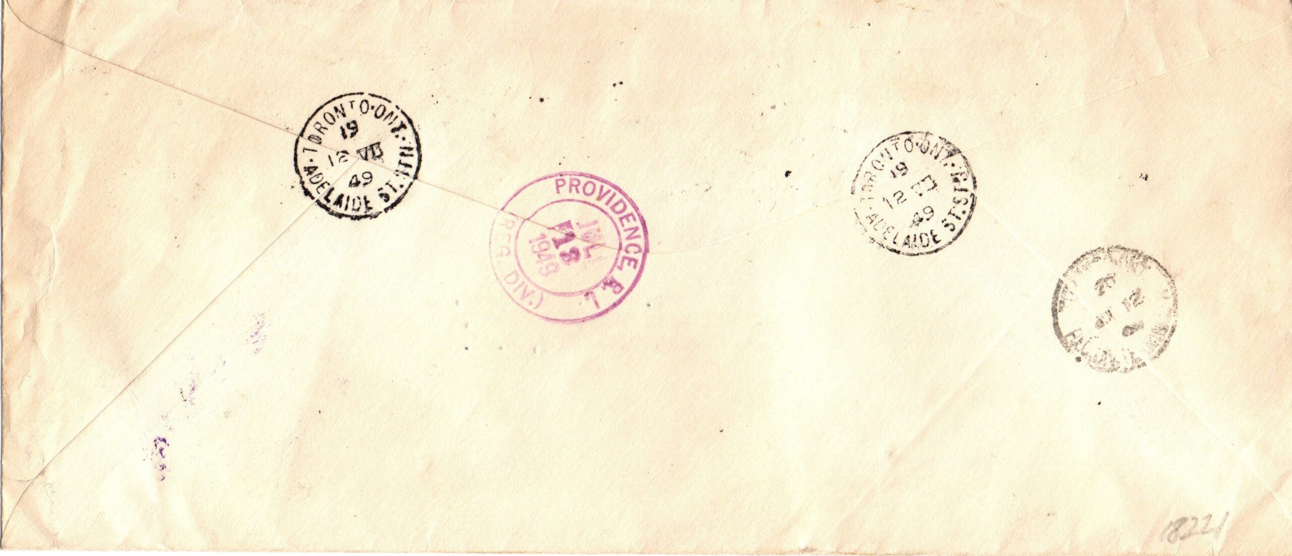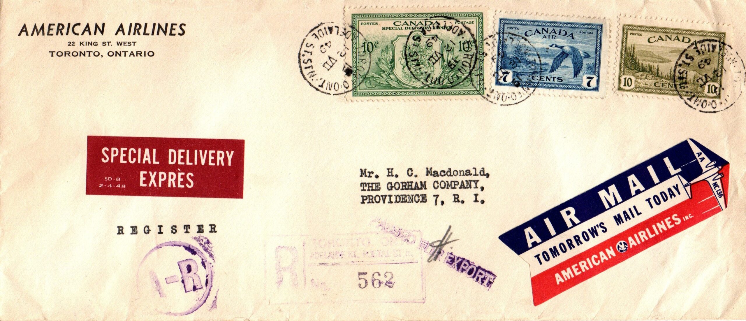 REGISTERED, A-R , SPECIAL DELIVERY cover from American Airlines addressed to The Gorham Company, The letter is franked with a 10c olive Great Bear Lake NWT from the King George VI Peace Issue (#268), 7c blue airmail Canada Gease near Sudbury ON, the last Airmail stamp issued (#C9) and 10c green special delivery from the Peace Issue, last Special Delivery stamp issued (#E11) 12/VII/49 ADELAIDE ST. STN. TORONTO ONT. Cds cancels and addressed to PROVIDENCE R. I. USA. The cover has a scarce AMERCICAN AIRLINES AIR MAIL TOMORROW’S MAIL TODAY label and a Special Delivery EXPRÈS sticker (SD-8 2-4-48). The front has a purple boxed Registration, a PASSED FOR EXPORT cancel, and A-R in circle handstamps. The back has PROVIDENCE R.I. (REG. DIV.) receiving cancel. Colorful and stamps used in period. The Gorham Manufacturing Company was one of the largest American manufacturers of sterling and silverplate and a foundry for bronze sculpture. »