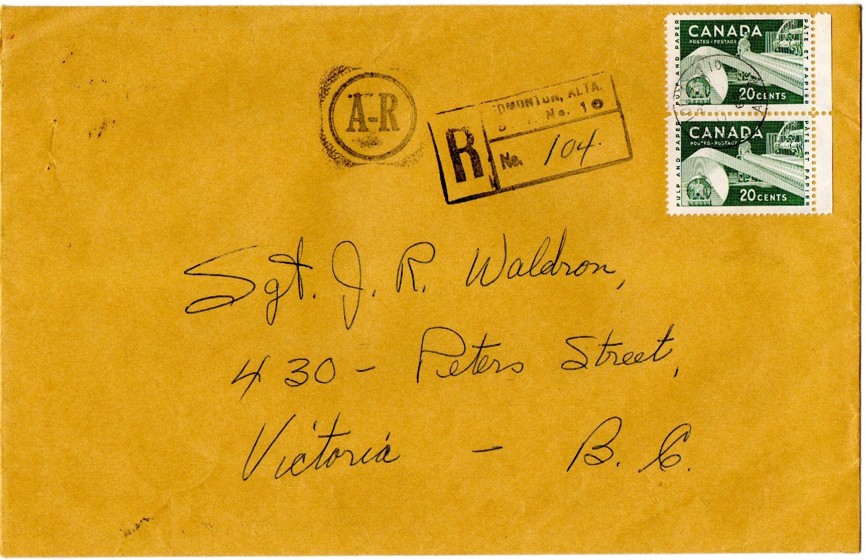 Canada 1966 A-R Registered cover EMONTON, ALTA STA No. 10 to VICTORIA B.C. mailed with a pair of Paper Industry from the INDUSTRY Issue #362, paying the 5 cents letter rate and 35 cents Registered under $25 fee. A Registered “R” box ÉEMONTON, ALTA STA No. 10.” in black, an “AR” circular cancel in black. CDS from EDMONTON SUB 10 ALTA. August 26, 1966, transit CDS EDMONTON ALTA. August 26, 1966 and receiver VICTORIA August 26, 1966. Same day delivery.