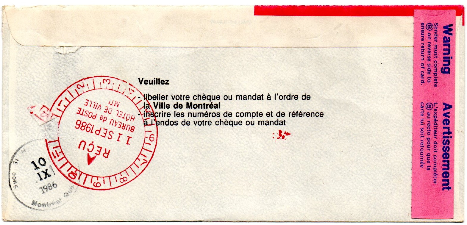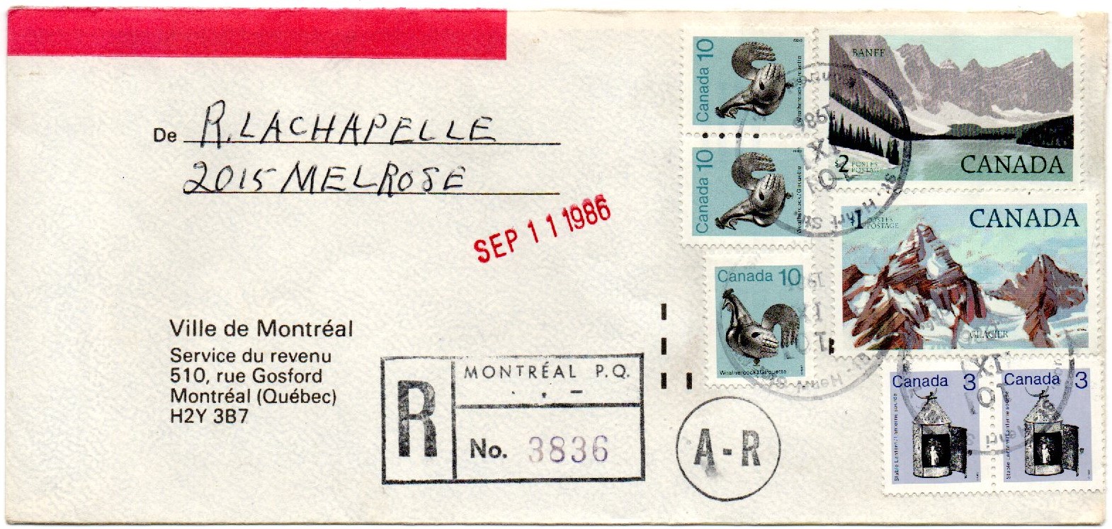 Canada 1986 A-R Registered $3.36 cover MONTREAL, P.Q. SUCC -STN ST-HENRI to CITY of MONTREAL P.Q. paying the 34 cents letter rate, $2.46 Registered fee and 56 cents for the AR return receipt. A pair of 3 cents Lantern #919, a pair and single 10 cents Weathercock #921 all from the LOW-VALUE ARTIFACT Definitives, and a $1 Glacier National Park #934 and $2 Banf National Park #936 both from the HIGH-VALUE NATIONAL PARK Definitives Issue. A “R” box MONTRÉAL, P.Q. cancel, and a circular “A-R” cancel both in black. A SUCC. ST-HENRI STN. MONTRÉAL QUÉ. September 10, 1986. . A receiver BUREAU DE POSTE HÔTEL DE VILLE MTL September 11 Received red cancel Also, the glued part of the AR card is still on the back. Nice correct usage in period.